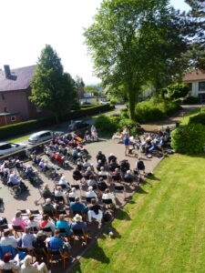 Unter dem Motto „Gemeinde leben“ feierte das Kreisaltenzentrum Helpsen gemeinsam mit der Kirchengemeinde Seggebruch einen Himmelfahrtsgottesdienst im Freien. Der Geschäftsführer, Christopher Merseburger begrüßte die Bewohnerinnen, Bewohner, Angehörige, Mitarbeitende, den Posaunenchor sowie viele Gemeindemitglieder und Gäste. Durch die musikalische Begleitung des Posaunenchores Seggebruch und tatkräftiger Hilfe von Mitarbeitenden des Kreisaltenzentrums wurde der Open-Air-Gottesdienst wieder zu einem besonderen traditionellen Highlight. Im Anschluss an den Gottesdienst waren alle Besucherinnen und Besucher zum Frühschoppen mit Kaltgetränken und Bratwurst eingeladen, um den tollen Vormittag am Kreisaltenzentrum in Gemeinschaft ausklingen zu lassen.